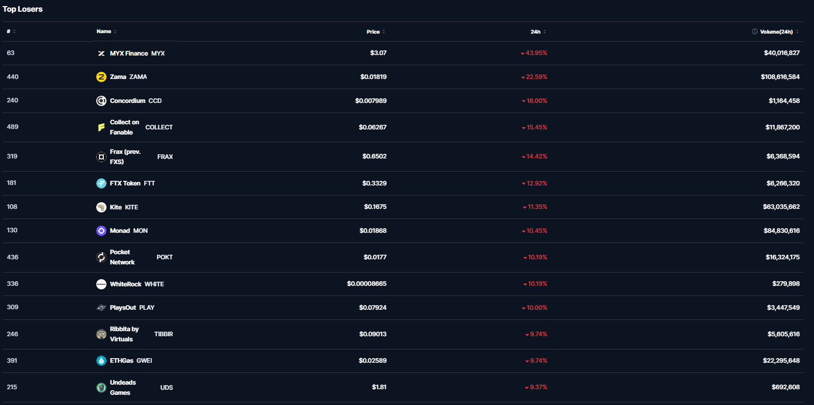 Başarılı bir veri sağlayıcısı olan CoinMarketCap’in aktardığı bilgilere göre ilk 500 kripto para birimi içerisinde son 24 saat özelinde en büyük düşüşü -%43 ile MYX gerçekleştirdi.