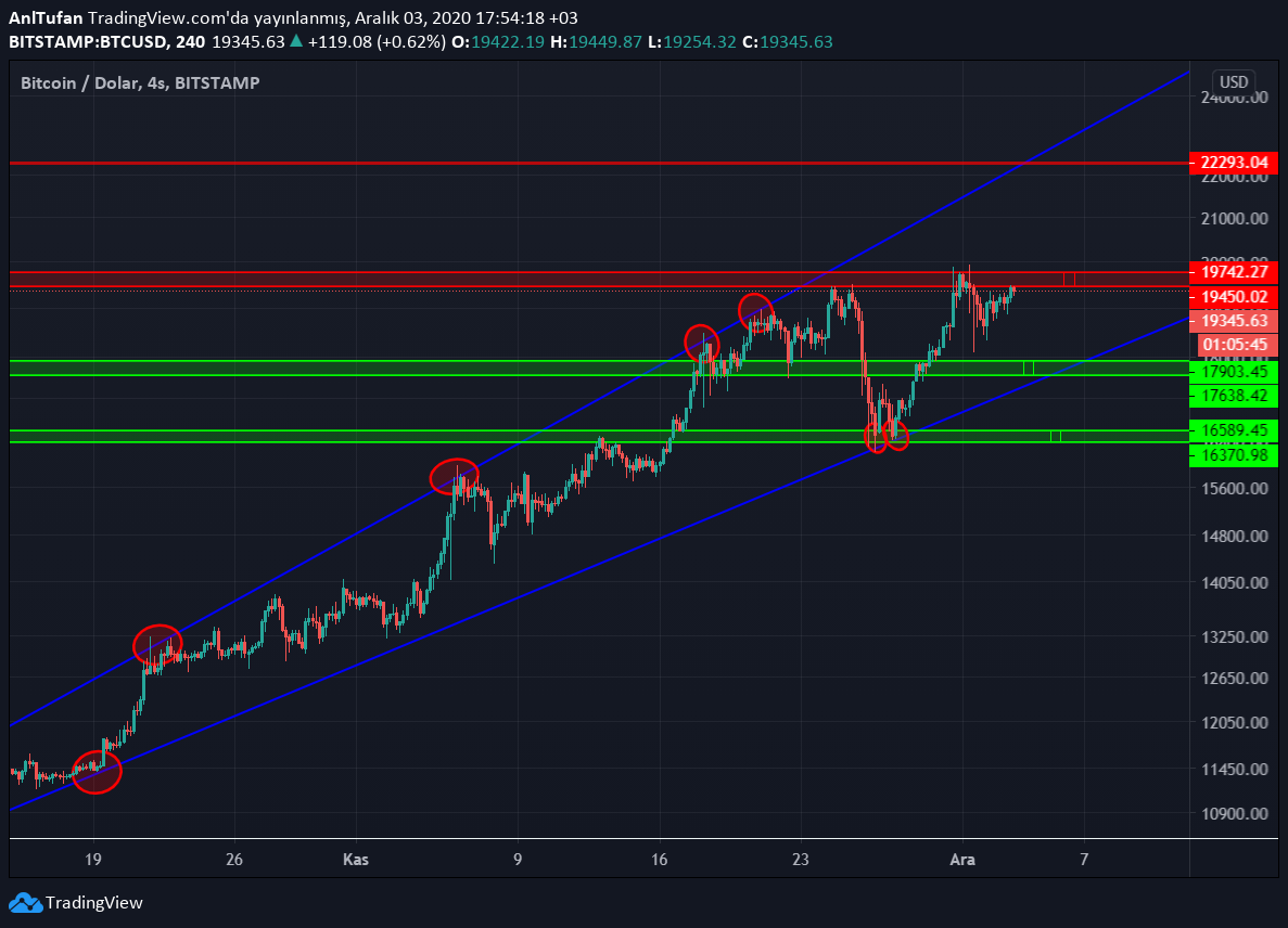 Bitcoin ayrık yükselen kanal içinde bulunuyor. Bir çok kez trendimizi teyit etmiş durumda bulunuyoruz. Şuan 19450-19750 direncinde bulunan Bitcoin bu seviye üzerinde kapanışlar yapmayı başarabilirse, ilk takip edeceğimiz seviye 20.000 psikolojik direnci olacaktır. Bitcoin’i 20.000 dolar üzeri hiç göremesek de yükselen ayrık kanalı ele alarak 22.300 seviyelerine bir yükseliş görmemiz muhtemel gözüküyor.