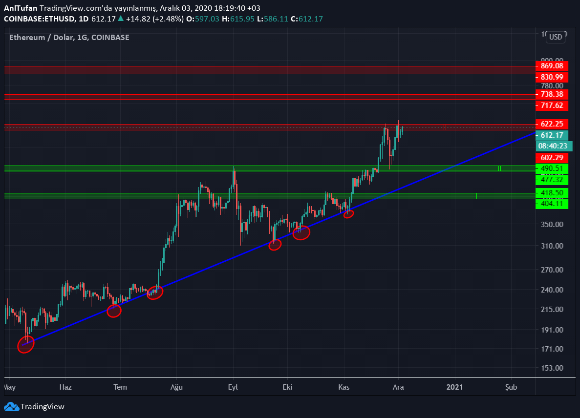 Ethereum majör direnç seviyesi olan 602-622 dolar seviyesinden reddedildikten sonra 490-477 destek seviyesine bir gerileme gördük. Bu seviyeden destek gören Ethereum tekrar majör direnç seviyesini zorluyor gibi görünüyor.