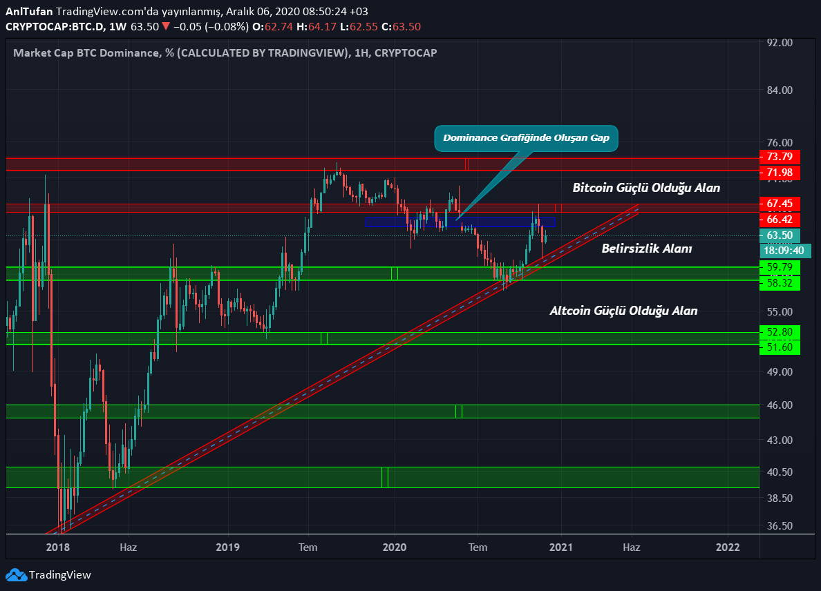 Yükselen trend ve yatay desteğimiz aşağı yönlü kırıldığı takdirde dominance tablosunda 50 seviyelerine kadar bir düşüş görmemiz olası gözüküyor. Böyle bir durum gerçekleştiğinde altcoinlerde çok sert 2017’ye benzer hareketler göreceğimizi söyleyen analistler dominance tablosunu yakından takip etmemizi öneriyor.