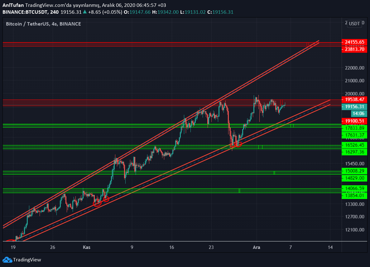 Yükselen ayrık kanalın içinde bulunan Bitcoin 20.000 dolar direncini hala kıramamış durumda. Her ne kadar 19,500-20.000 dolar direncini denese her seferinde reddedilmeye devam ediyor.