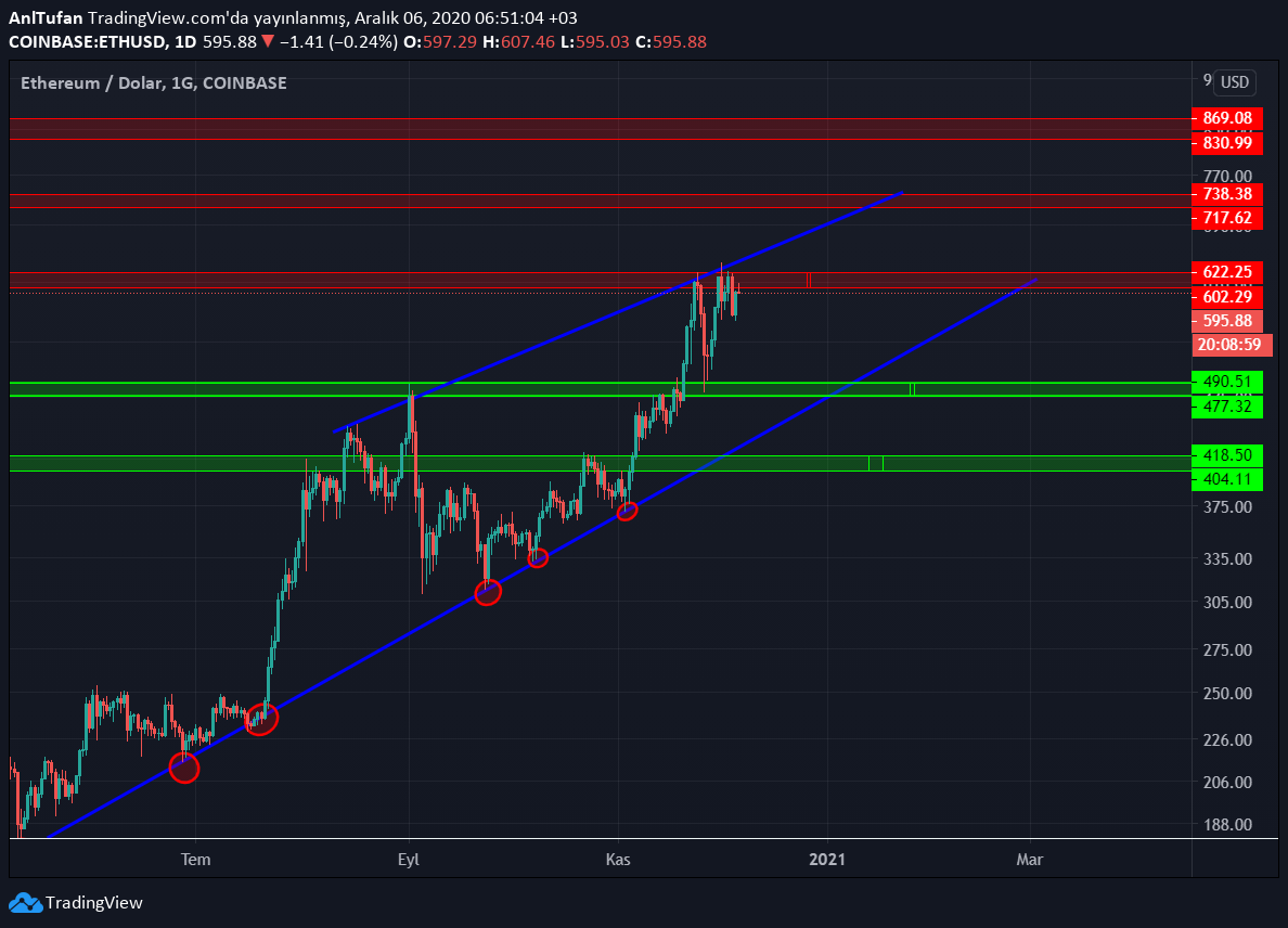 Bitcoin’e benzer hareketler yapan Ethereum’da grafik görünümleri de çok benzer duruyor. Yükselen ayrık kanal içinde bulunan Ethereum kritik 600 dolar direnci üzerinde kalmayı halen başaramadı.