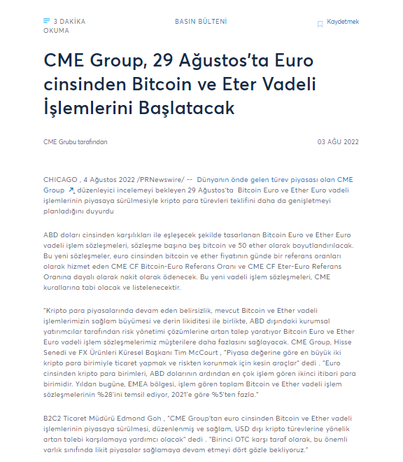 Bugün yapılan son basın açıklamasına göre CME Group, Bitcoin ve Ethereum için Euro paritesinde vadeli işlemlerin yapılmasına olanak sağlayacak.