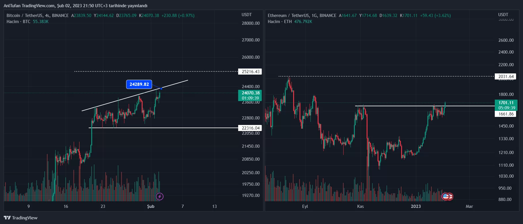 Son saatlerde Bitcoin 24 bin dolar seviyesinin üzerine çıkarken, Ethereum’un da 1.700 dolar direnç seviyesini aştığı görülüyor. Bu direnç kırılımları haliyle altcoin‘lerin de hareketlenmesini sağladı.