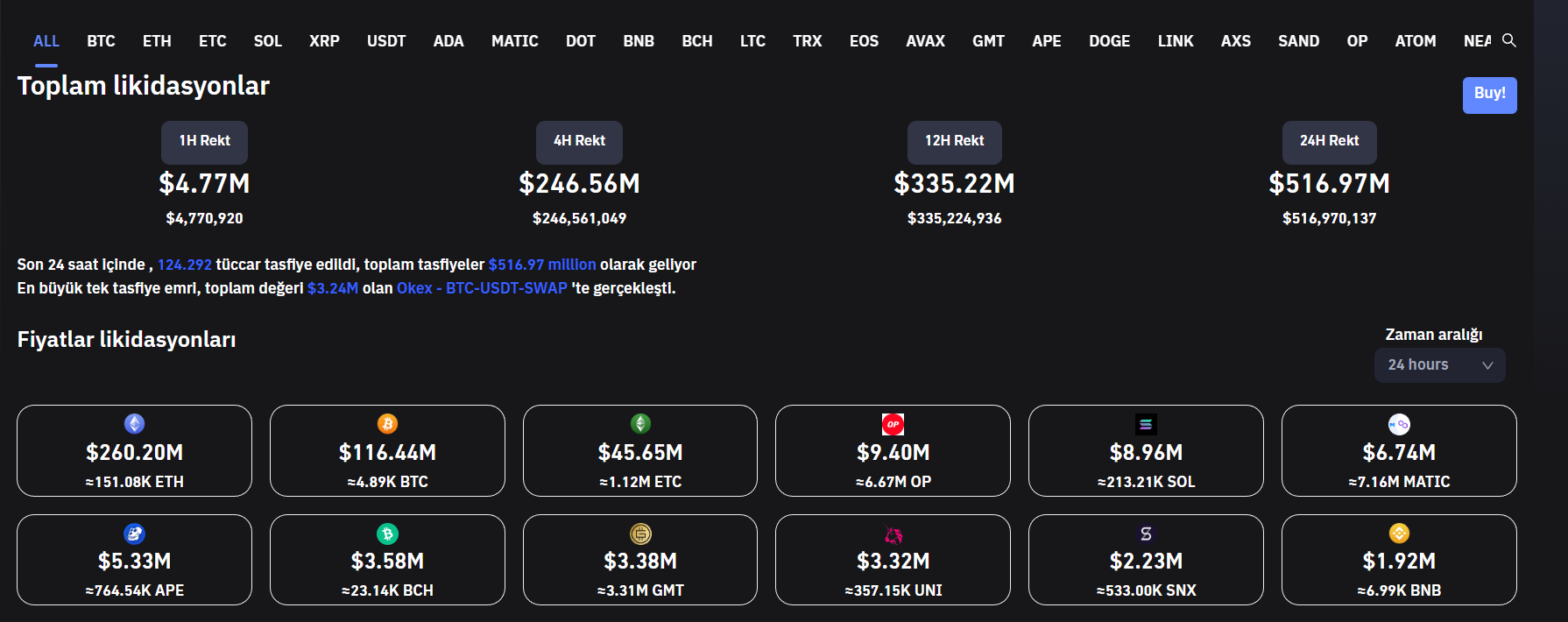 Bu yaşanan likidasyonun büyük çoğunluğu short pozisyonlar oluştururken, ara ara devasa kaldıraç oranlarını kullanarak long pozisyon açanlarda likit edilmekte.