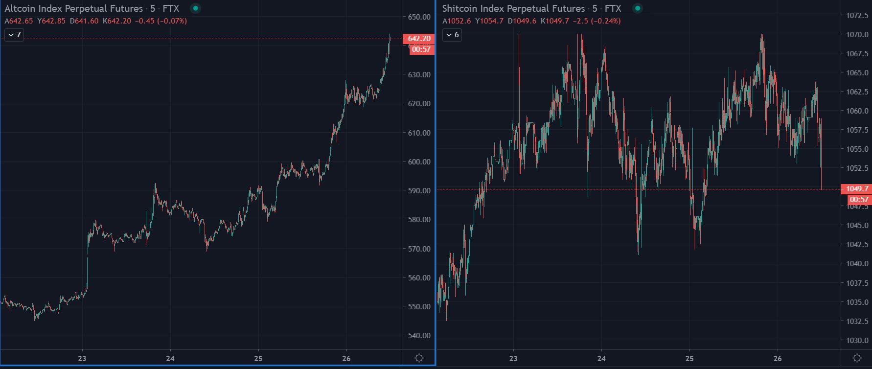 Son birkaç güne bakıldığında ALTPERP‘ün (yani en hacimli 7 tane altcoinin -ETH, EOS, XRP, BCH, BSV, LTC, BNB- ortalaması) SHITPERP‘den (hacimsiz olarak seçilmiş 50 altcoinin ortalaması) çok daha güçlü durduğu; yani son birkaç günlük periyotta ETH’nin sert yükselmesiyle hacimli altcoinlerin yükseliş yaşayıp, hacimsizlerin ise genel manada düşüş yaşadığı görülüyor.