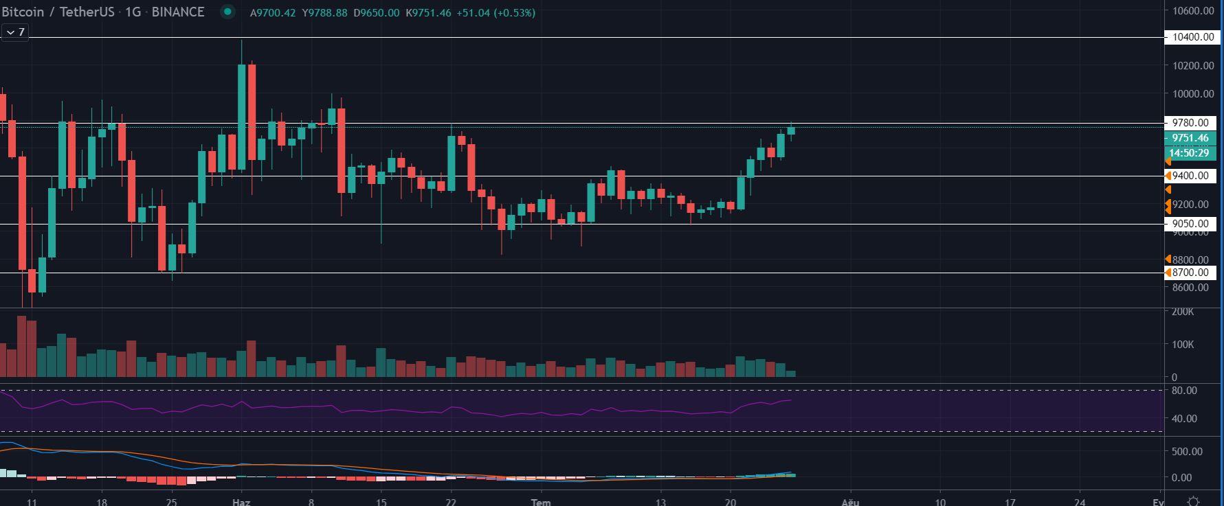 Bitcoin tarafında ise 9780 dolardaki direncin önemli olduğu ve 10.000 dolar üzerindeki en büyük engelin bu direnç olduğu görülüyor. Özellikle bu direncin kırılması ile birlikte yeni bir FOMO etkisinin tetiklenebileceği ve yükselişlerin devam edebileceği düşünülüyor. Yine BTC’de de 9400 – 9500 bandının üzerindeki fiyatlanmalar ve bu seviyenin altına sarkış olmaması, piyasanın önümüzdeki günlerdeki akıbeti için olumlu olacaktır.