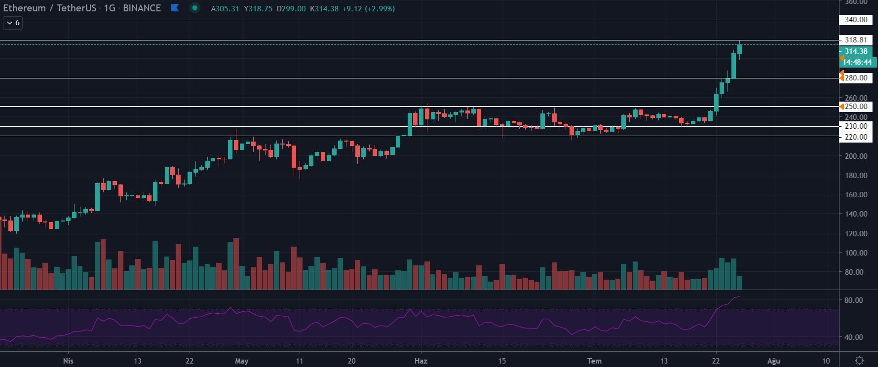 Uzun bir süredir yatay seyir eden kripto para piyasası Ağustos ayında ETH 2.0 sürecinin test aşamasının başlaması haberi üzerine suskunluğunu bozdu. Ethereum için hayati bir öneme sahip olan 2.0 güncellemesi haberlerinin gelmesi ile beraber adeta zincirlerini kıran Ethereum, 320 dolar seviyesine kadar dayandı.