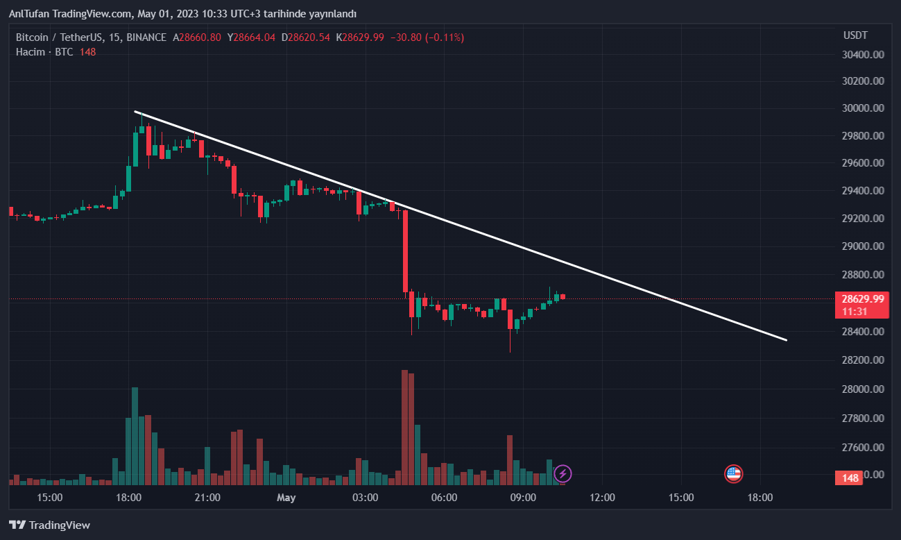 İlerleyen saatlerde ise Bitcoin’in 15 dakikalık grafik üzerindeki düşen trendini kırmayı başarması, yeniden 30 bin dolar seviyelerine doğru yükselişlerin başlamasını sağlayacaktır.