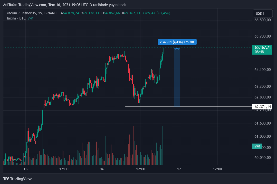 Bitcoin gün içerisinde 62.370 dolar seviyelerine kadar gerilemiş olsa da, son dakikalarda yaşadığı yükselişlerin ardından 65 bin doları aşmayı başardı.