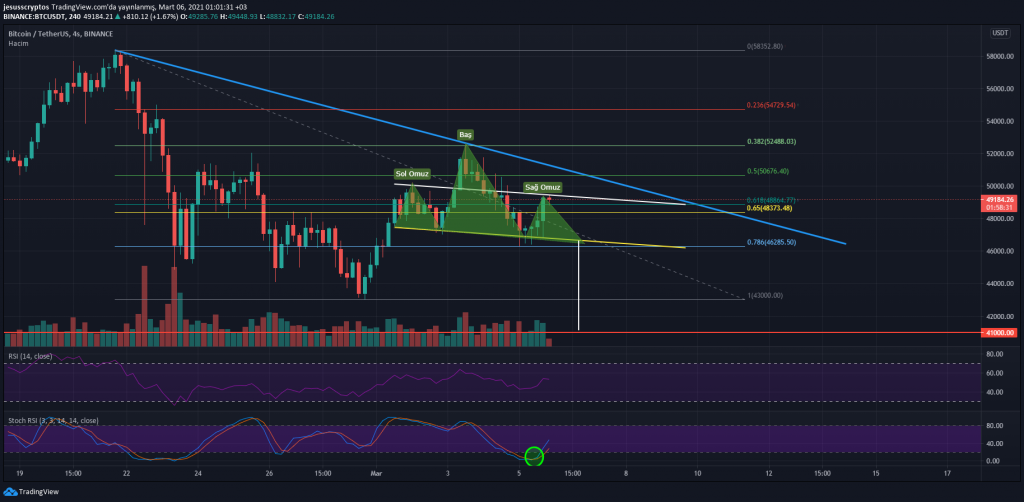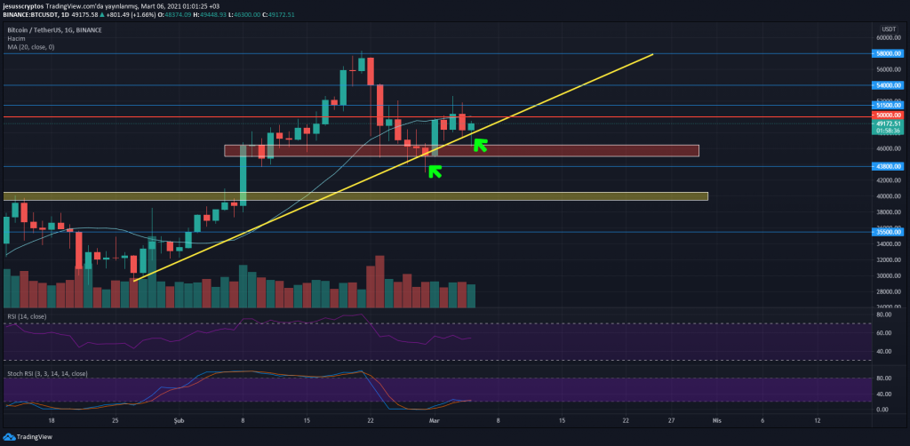 Psikolojik direnç olan 50000 dolara doğru ilerleyen BTC’nin bu sefer de burayı aşamaması durumunda 39500 – 40500 dolar aralığına doğru bir düşüş yaşaması bekleniyor. Analistler sarı trend çizgisi üzerinde yoğunlaştığında, pozitif bir formasyonun oluştuğunu söylüyor.