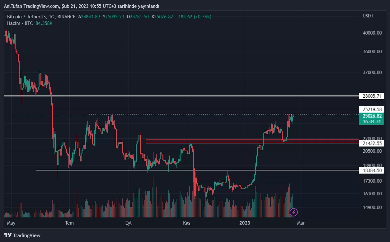 Lider kripto para birimi Bitcoin (BTC), yeni güne yine yükseliş ile başlamış gibi gözükmekte. 16 Şubat tarihinden beri 25.250 dolar direncini zorlayan Bitcoin, bu direnç seviyesinin üzerine iğne dahi atmayı başaramamış durumda.