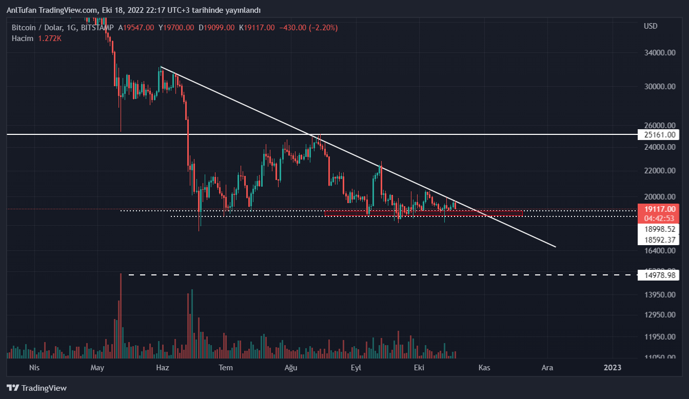 1 Haziran tarihinden bu yana hep alçalan tepe yaptığı görülen Bitcoin’in, 18.500 – 19 bin dolar desteğinde tutunduğu görülüyor.