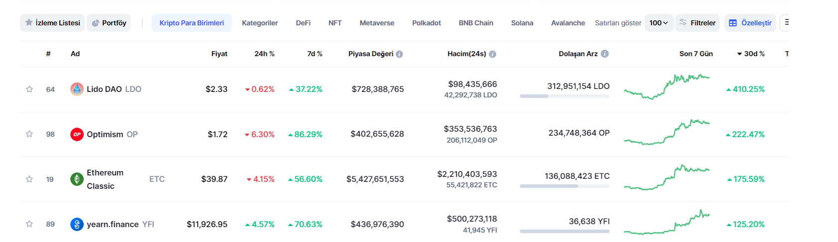 CoinMarketCap’in aktardıklarına göre, Optimism ile birlikte zirve seviyede yer alan LDO, yatırımcılarının devasa oranda kar elde etmesini sağladı.