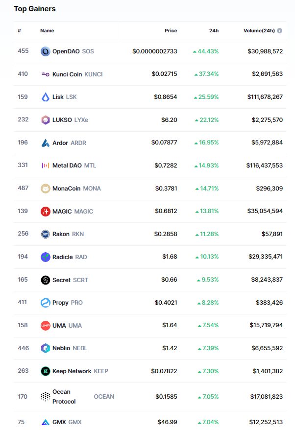 Başarılı bir veri sağlayıcısı olan CoinMarketCap’in aktardıklarına göre, son 24 saat içerisinde en fazla yükselişi OpenDAO (SOS) isimli altcoin gerçekleştirdi.