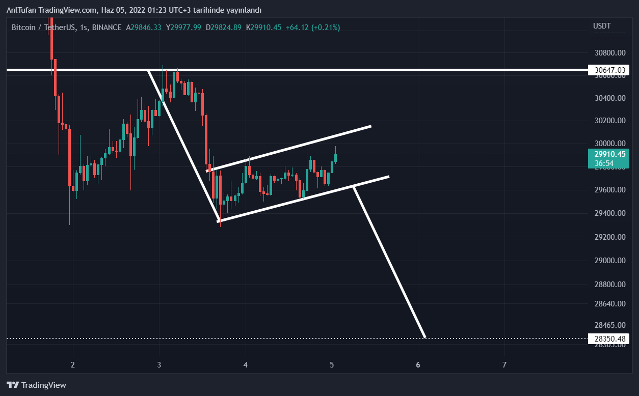 BTC‘nin bu bayrak formasyonunun üst trend bölgesi olan 30.100 doları kırması durumunda ise okurlarımızın 30.650 doları takip etmeleri gerekiyor.