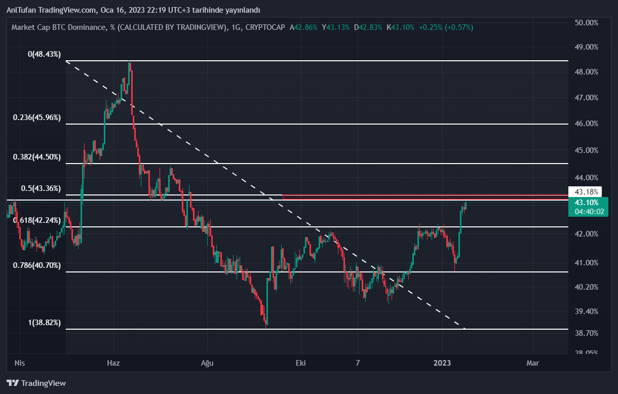 Kritik direnç noktasının hemen altında yer alan BTC dominans tablosu, bu direnç noktasından halen reddedilmediği için altcoin’ler Bitcoin’in yükselişleri karşısında ezilmekte.