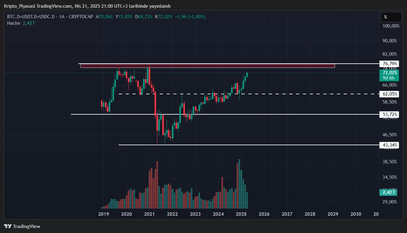 İlerleyen süreçte bu tablonun %75 – %77 major direnç bölgesine ulaşması bekleniyor. Bu direnç noktasından gelebilecek sert bir reddedilme, BTC’deki yükselişlerle birleşmesi durumunda piyasada büyük bir altcoin rallisi yaşanabilir.