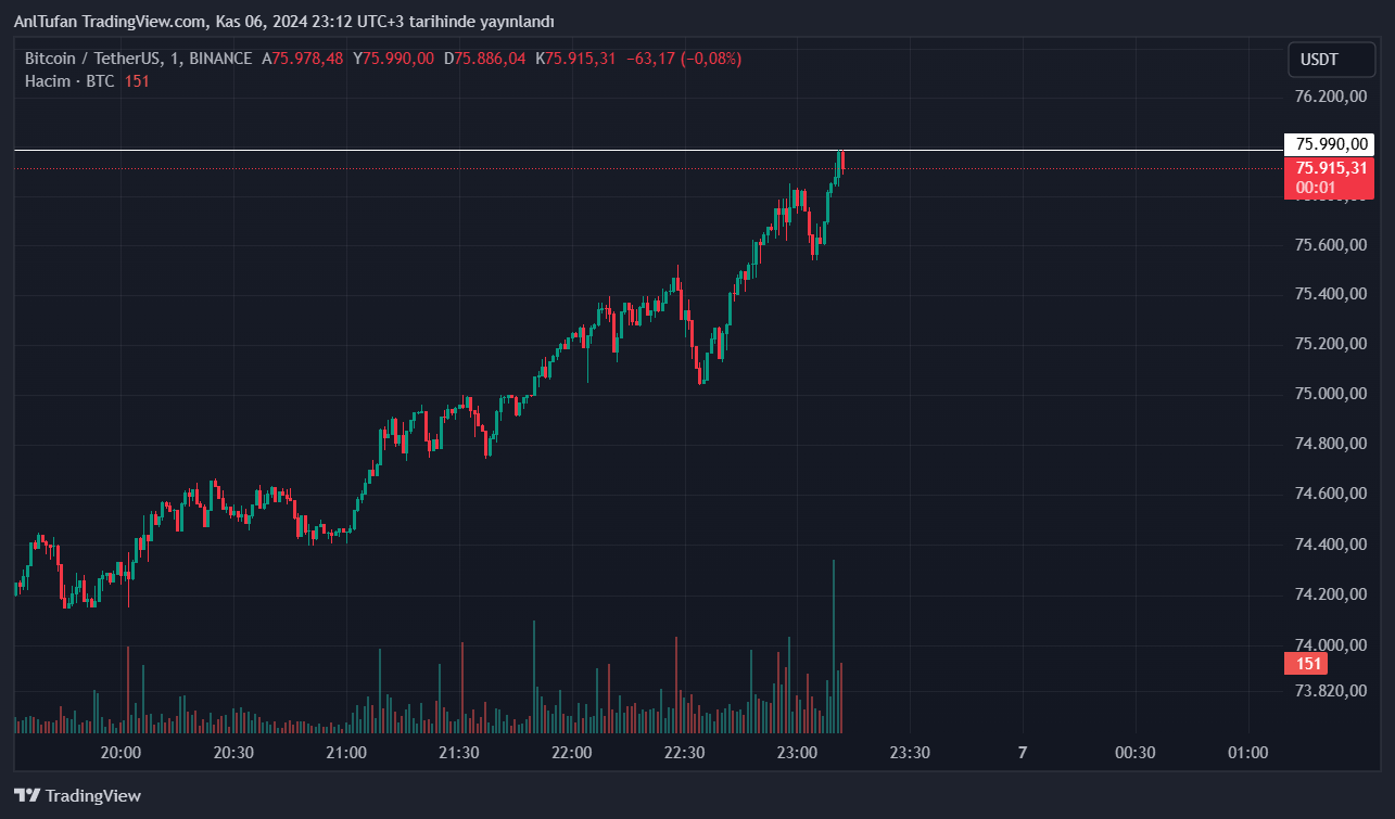 Bu sabah saatlerinde Donald Trump’ın başkanlığının iyi bir seçim performansı göstermesi ile birlikte 75.420 dolar seviyelerine ulaşan BTC, son dakikalarda tekrardan ani yükselişler gerçekleştirmeye başladı.