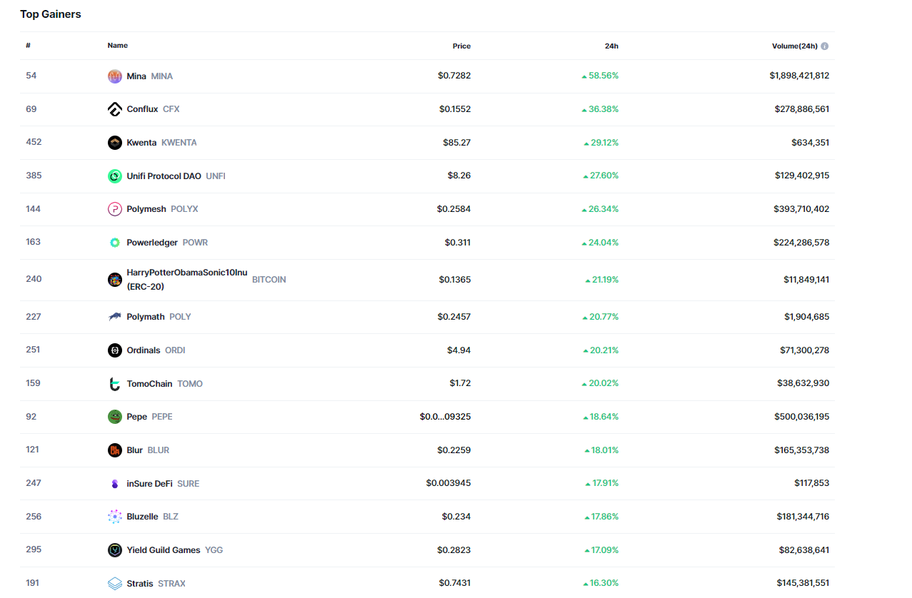 Başarılı bir veri sağlayıcısı olan CoinMarketCap’in aktardıklarına göre bugünün en çok yükselen ürünü UPbit borsasında listelenen MINA oldu.