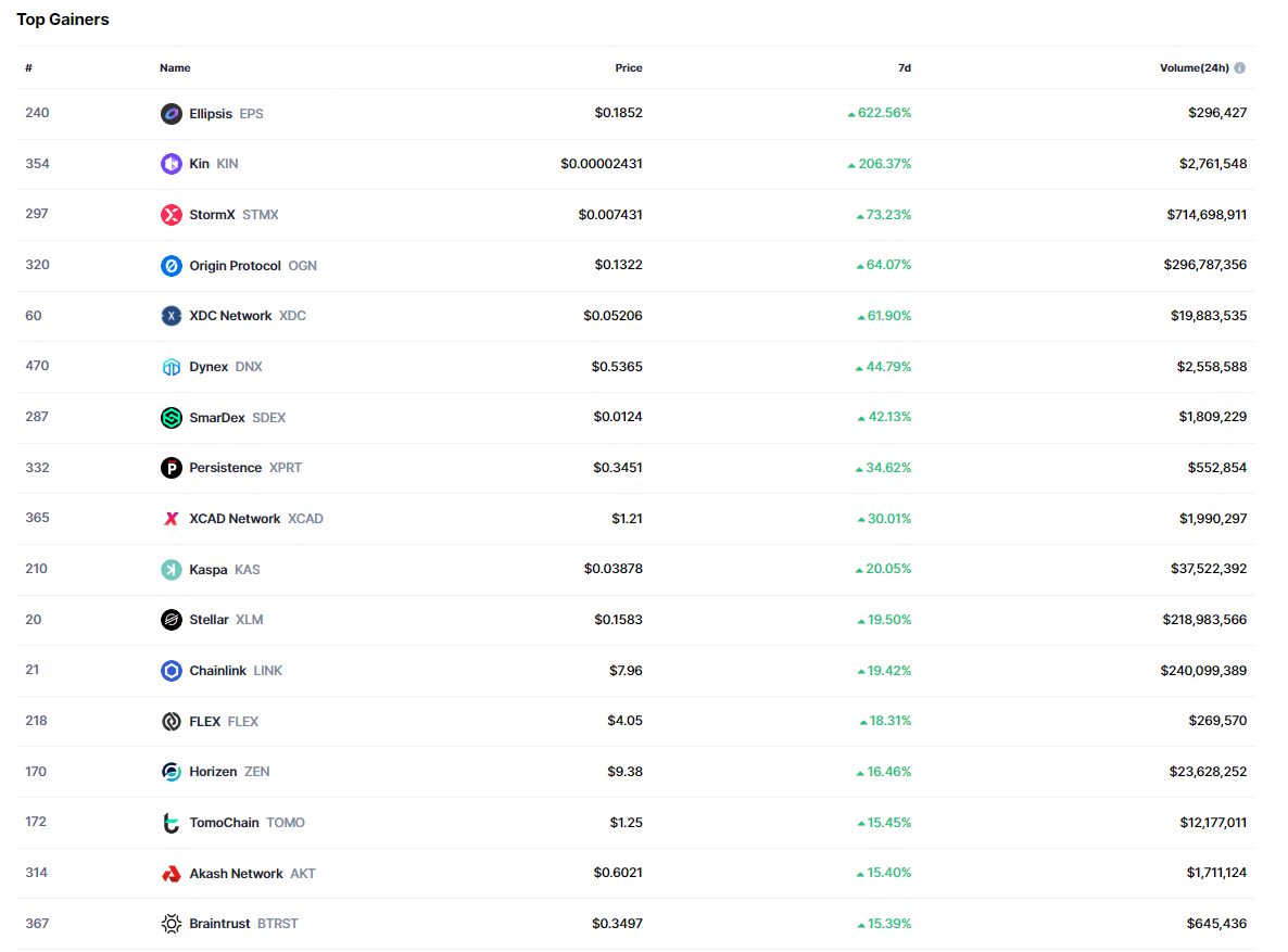 Başarılı bir veri sağlayıcısı olan CoinMarketCap’in aktardığı bilgilere göre bu hafta itibariyle en büyük yükselişi Ellipsis (EPS) isimli altcoin yaşadı.