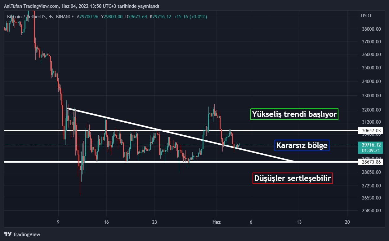 Haberimizin yazıldığı esnada 29.700 dolar seviyelerinden işlem gören lider kripto para birimi, halen kararsız bölge olarak adlandırdığımız 30.650 – 28.650 dolar aralığından konumlanıyor.