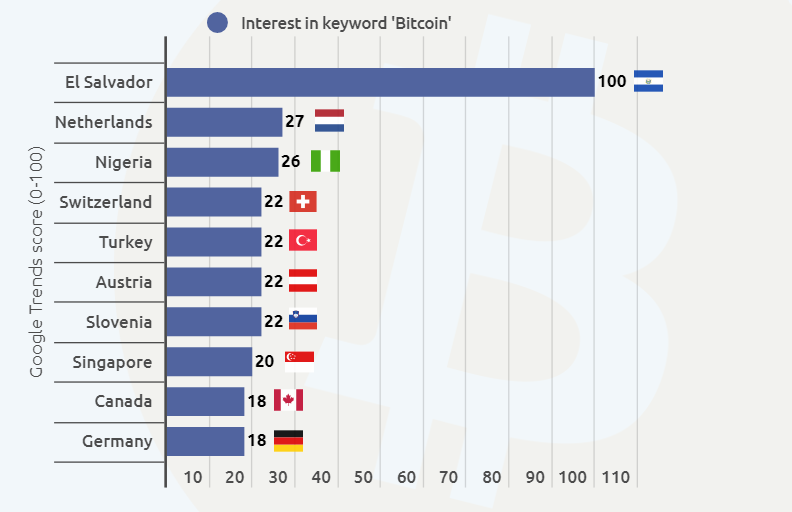 Özellikle El Salvador, 100 popülerlik puanı ile Bitcoin’e en fazla ilgi gösteren ülkelerin arasında lider olduğu görülüyor.