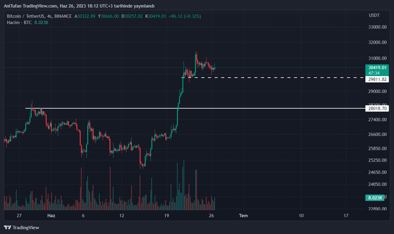 Şuan itibariyle ise Bitcoin’in 29.800 – 31.500 dolar aralığında akümüle olduğu görülüyor. Haberimizin yazıldığı esnada 30.400 dolar seviyelerinde yer alan BTC, yeni haftaya pekte iyi başlayamadı.