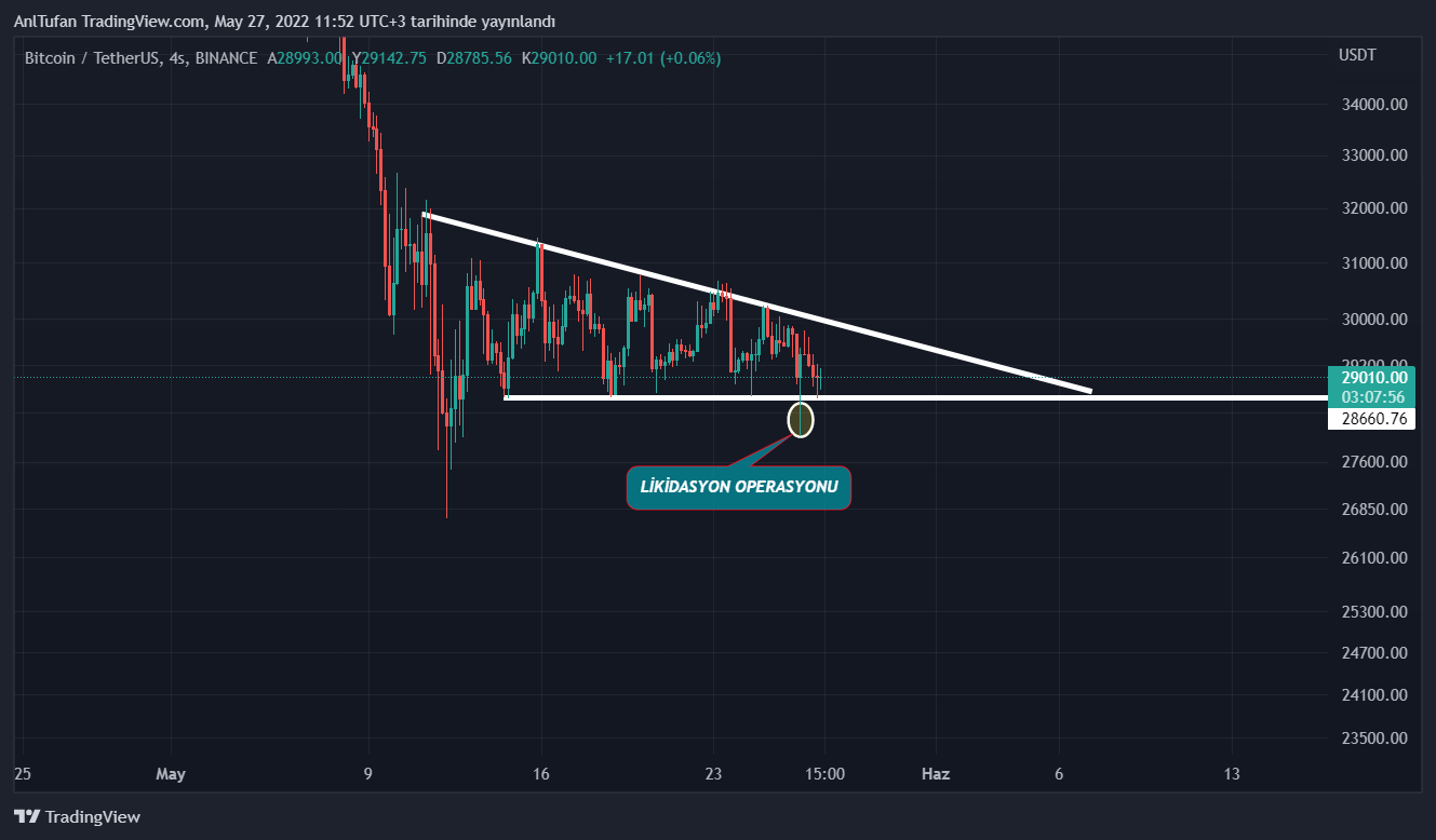 Bugün özelinde de yine 28.700 dolar desteğini zorlamasını beklediğimiz BTC, bu destek seviyesi altında bir kapanış yapması halinde çok daha büyük çöküşler yaşayacak gibi gözükmekte.