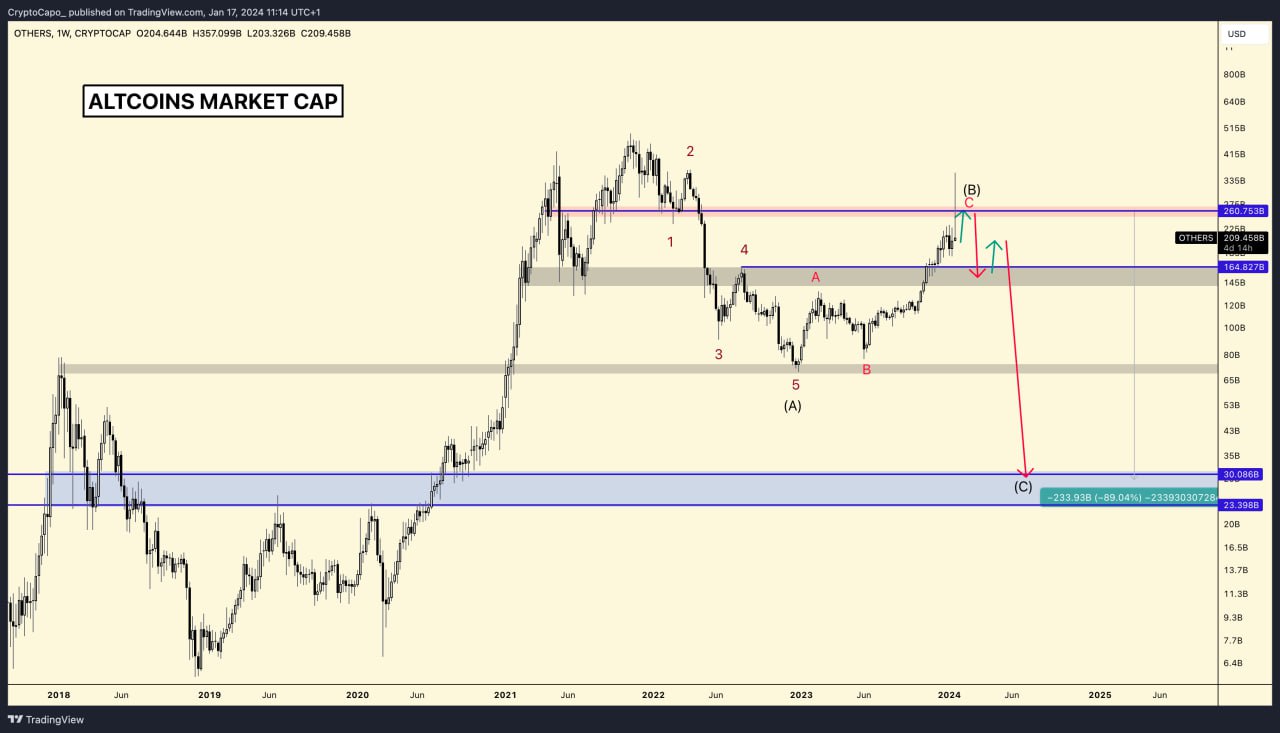 Capo bu yükselişin büyük çöküş öncesi son çıkış olacağını düşünüyor. Popüler analiste göre sürecin ilerlemesiyle altcoin’lerin toplam piyasa değeri 260 milyar dolardan 30 milyar dolar seviyesine %89’luk bir düşüş yaşayacak.