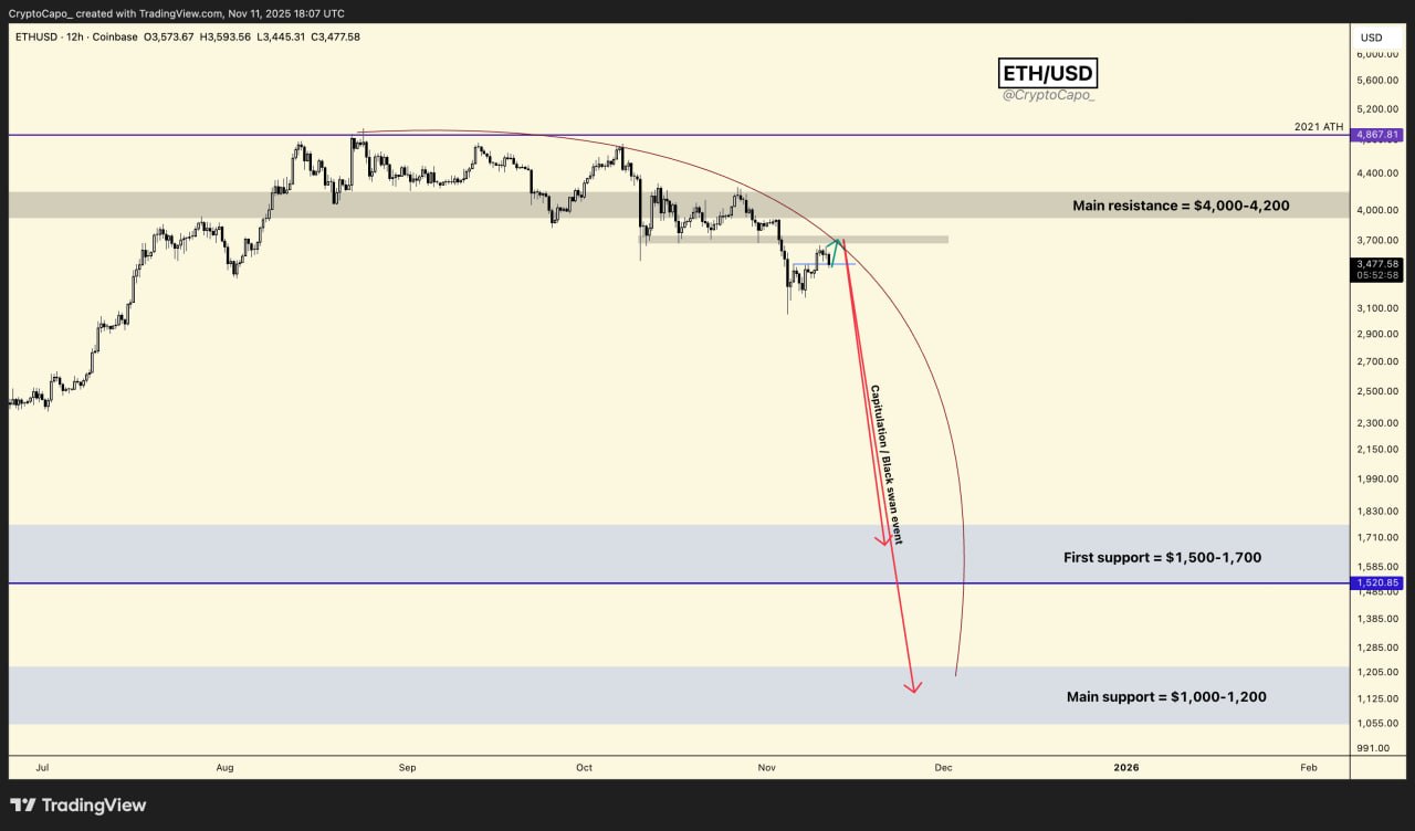 Crypto Capo bugün itibariyle ise Ethereum (ETH) ve genel altcoin piyasasına ilişkin yeni bir rapor paylaştı. Capo son raporuna göre ETH’nin ilerleyen süreçte 1.000 dolar seviyelerine kadar gerileyebileceğini savunuyor.