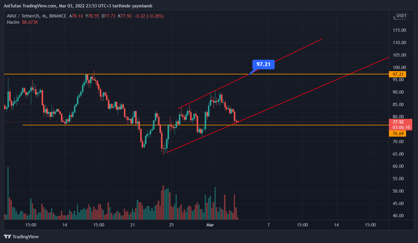 Bir yükselen kanal görüntüsü bulunan AVAX’ın, ilerleyen günlerde kanalın üst bandını denemesi durumunda ise 100 dolar seviyelerine kadar yükseliş gerçekleştirebilir.