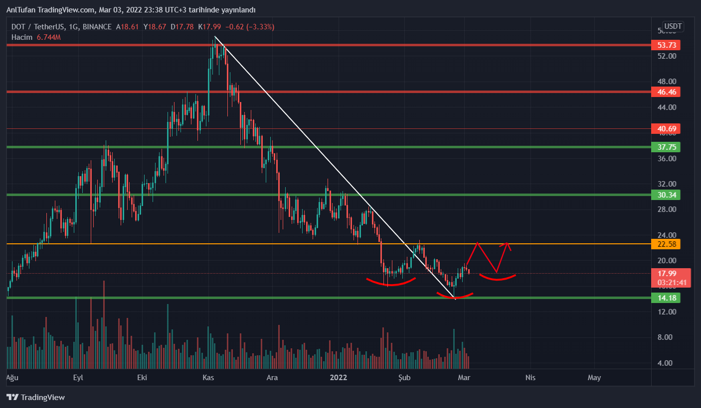 Günlük grafikte düşen trendini kırmış olan Polkadot, Bitcoin’in biraz toparlanmasıyla beraber 22 dolar seviyelerine kadar hızlıca bir yükseliş sergileyebilir.