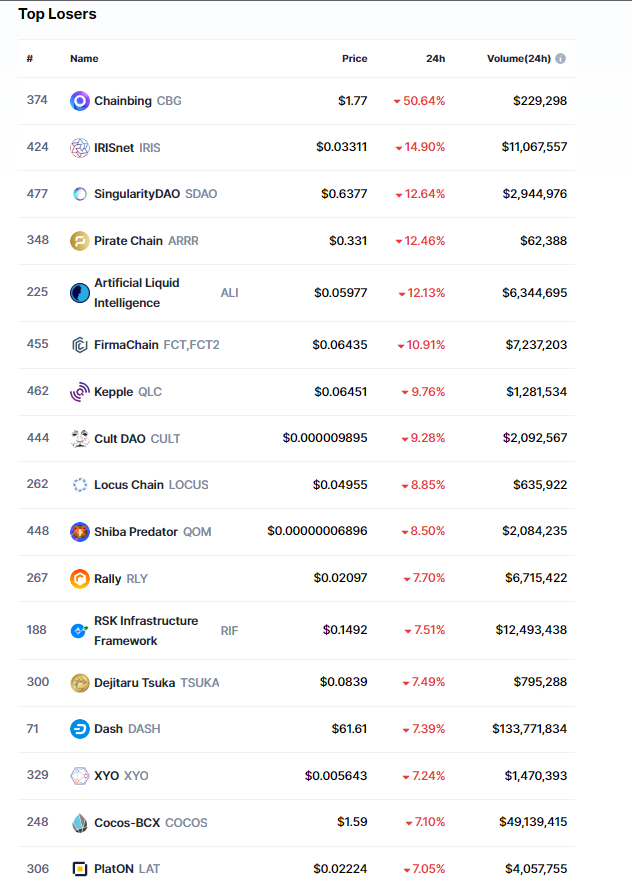 CBG haricinde aşağıda yer alan altcoin’lerde bugün kayda değer düşüşler yaşadı: