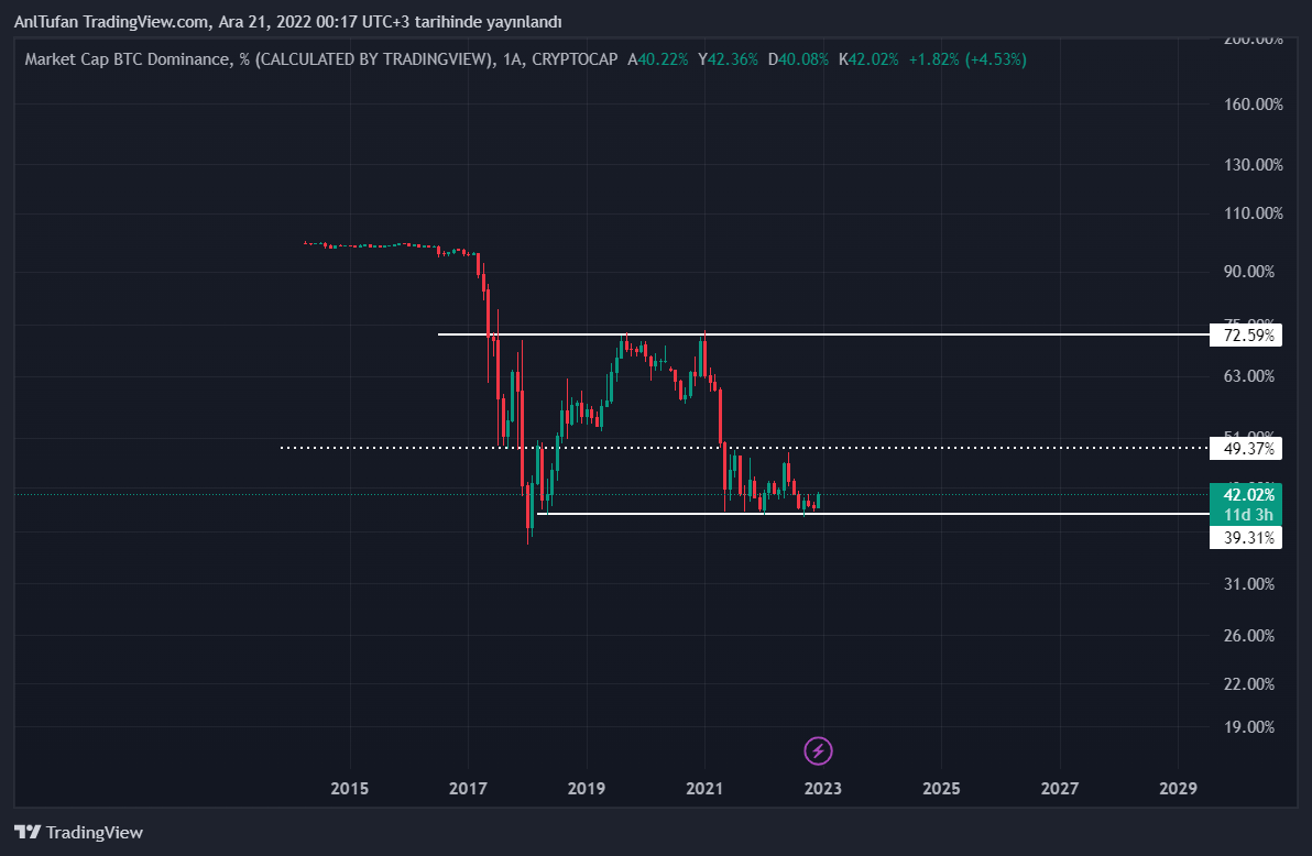 Bitcoin dominans tablosunu aylık grafik üzerinde incelediğimizde, kritik bir destek noktasından tepki aldığı görülebiliyor.