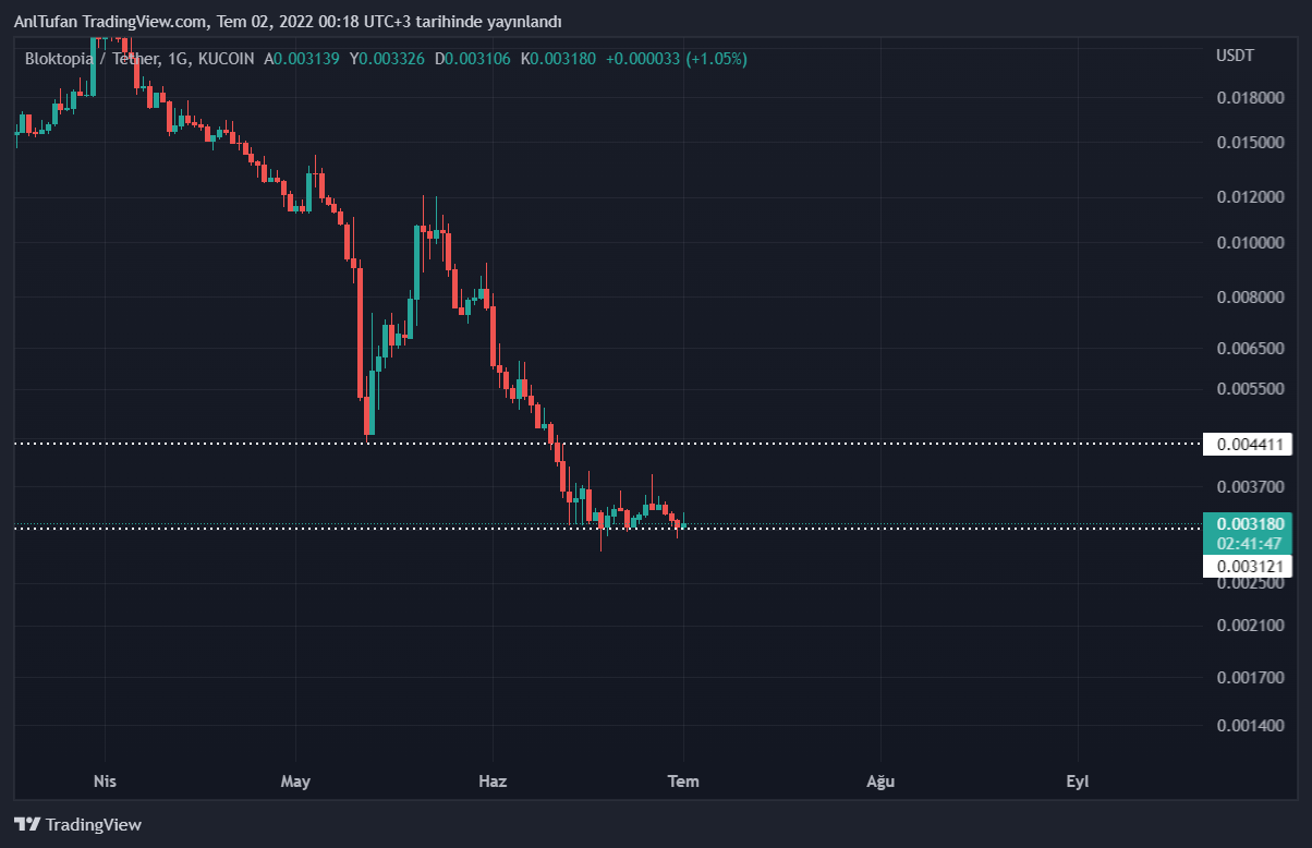 Yatırımcılarına büyük bir hayal kırıklığı yaşatan Bloktopia, halen dip seviyelerde yer alıyor. 0.0031 dolar desteğinin üzerinde yer alan BLOK her ne kadar ilerleyen süreçte 0.0044 dolar direncine kadar yükseliş yaşayabilecek olsa da, bu seviyeyi aşması beklenmemekte.