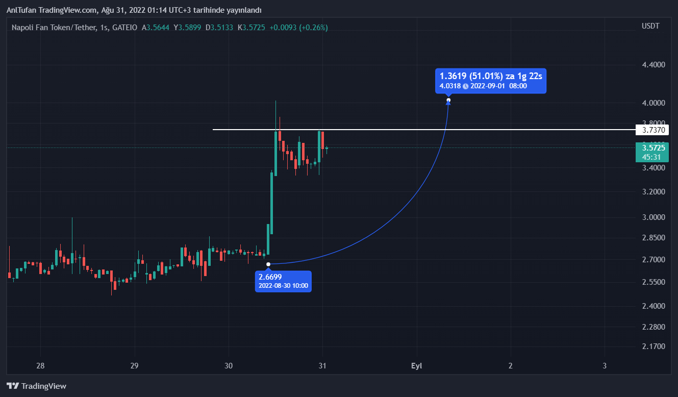 CR7 iddiaları sonrası 2.72 dolardan 4 dolara kadar yüzde 50’lik bir yükseliş yaşayan Napoli Fan Token, şuan itibariyle 3.73 dolar direncinin altında akümüle olmaya devam ediyor.