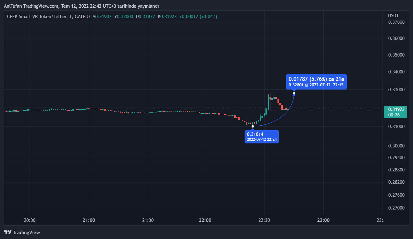 Bu paylaşılan tweet’in ardından dakikalar içerisinde yüzde 7 oranında yükseliş yaşayan CEEK VR, yeni bir boğa trendi başlatabilir.