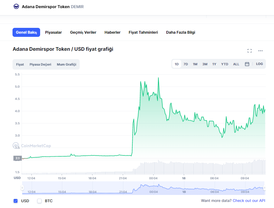 Adana Demirspor Fan Token (DEMIR) bu yaşananların ardından 2.15 dolar seviyelerinden ani bir atak yaparak 5.36 dolar seviyelerine kadar yükseliş yaşadı.