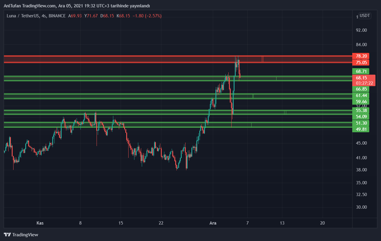 Yayın saati itibariyle bulunduğu destek seviyesinden tekrardan yükselişe geçmesi durumunda, en önemli major direnç seviyesi olan 75- 78 dolar direncine kadar yükselebilecek olan LUNA, böyle bir yükseliş yapması durumunda yatırımcılarına %15’ten fazla kazanç getirebilir gibi duruyor.