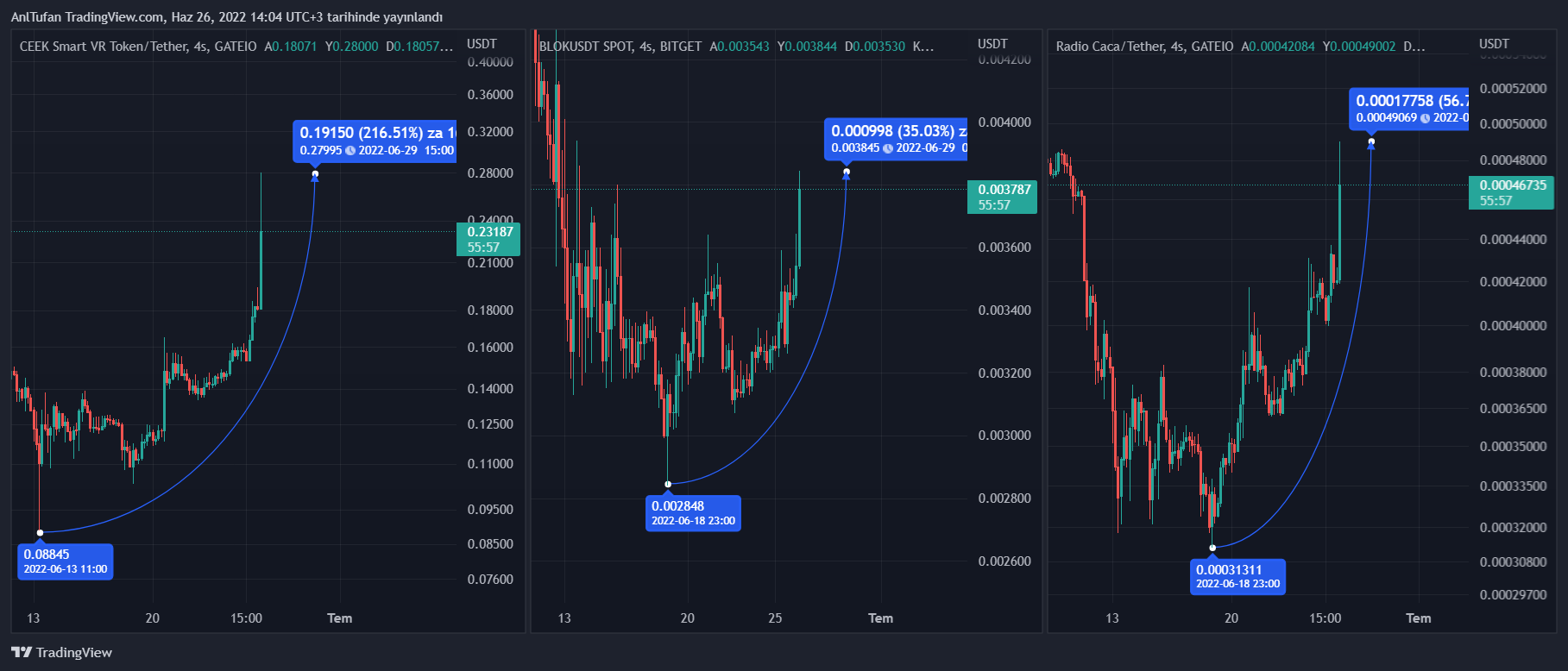 Son dip seviyeden CEEK yüzde 200’den fazla yükselmesiyle göz dolduruyor. RACA dip noktadan yüzde 56 oranında yükseliş yaşarken, BLOK‘da ise bu oran şimdilik yüzde 35 olarak görülmekte.