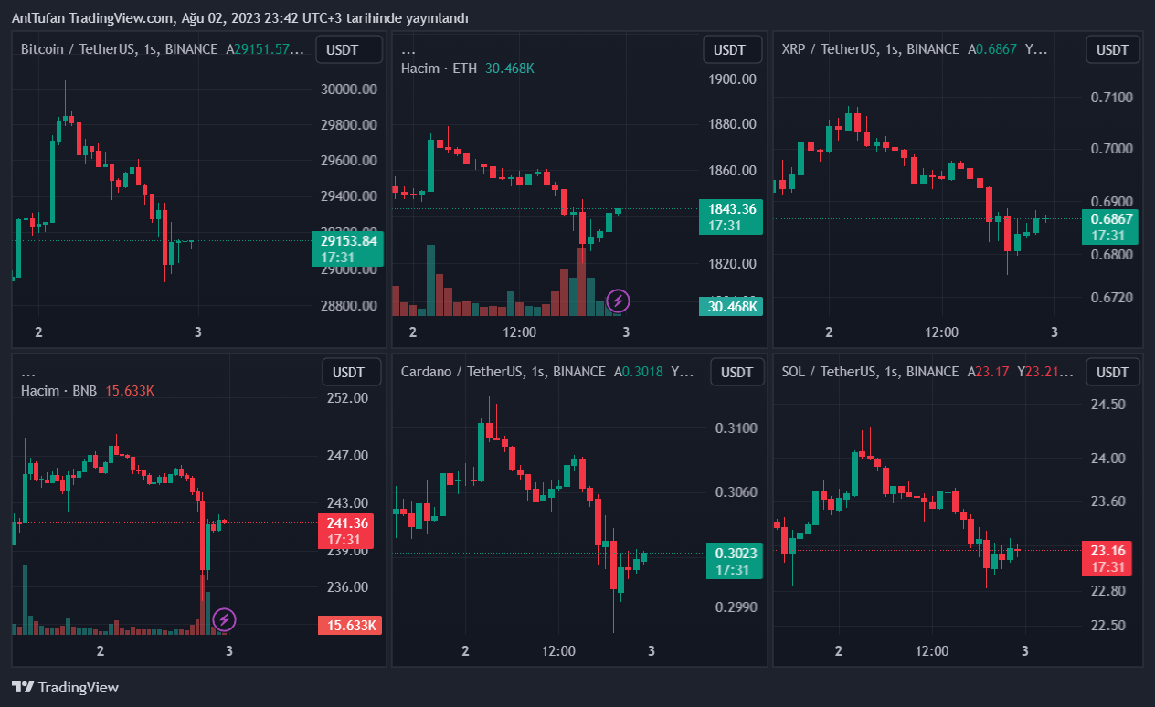 Yukarıdaki tabloda Bitcoin, ETH, XRP, BNB, ADA ve SOL‘un kısa vadedeki görünümü yer alıyor. Tüm ürünler son saatlerde ciddi düşüşler yaşadı.