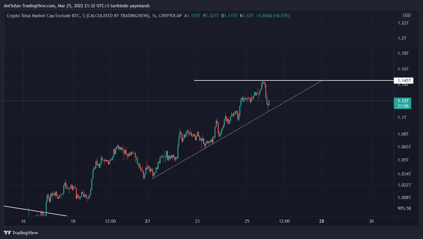 Total 2 grafiğinde düşüşler yaşanmaya devam ediyor. 1.15 trilyon değere ulaşan toplam altcoin piyasa değeri grafiği 1.10 trilyon dolara kadara geriledi.
