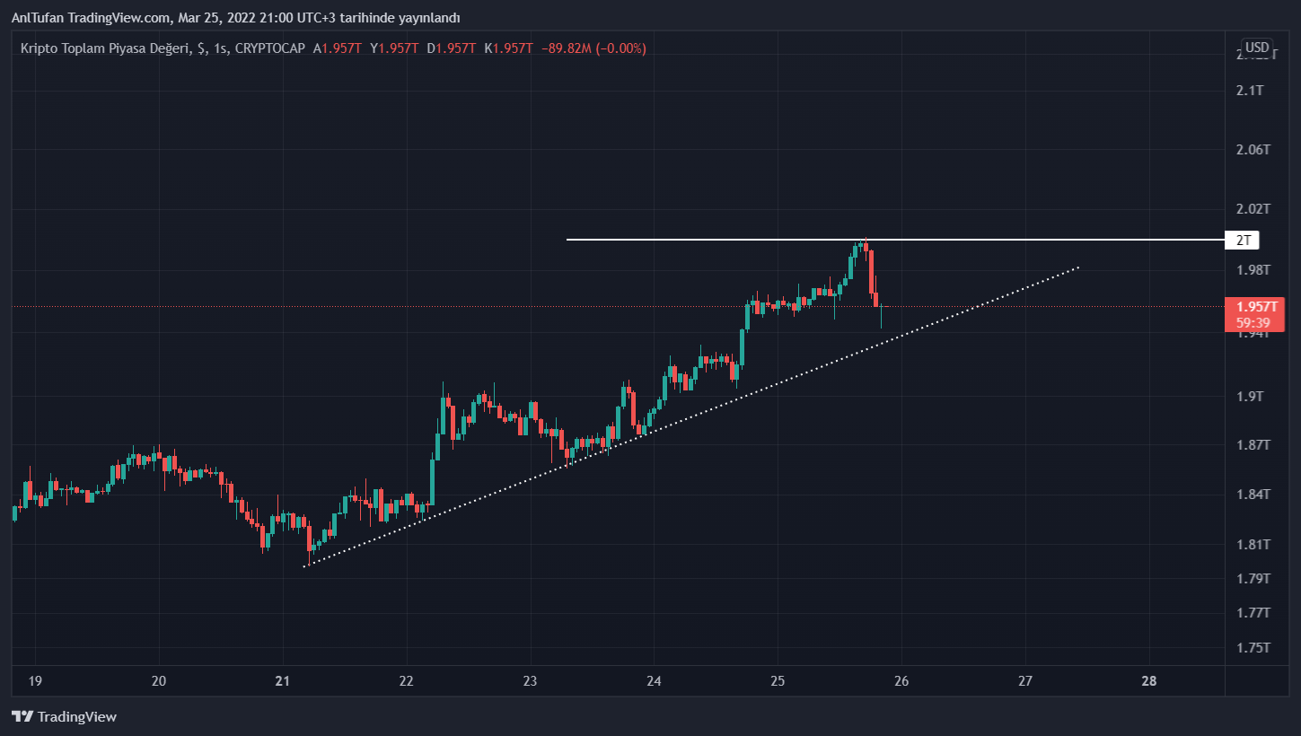 Bugün itibariyle 2 trilyon dolara ulaşan total market cap, bu direnç seviyesinden sert bir reddedilme yaşayarak 1.94 trilyon dolara kadar geriledi.