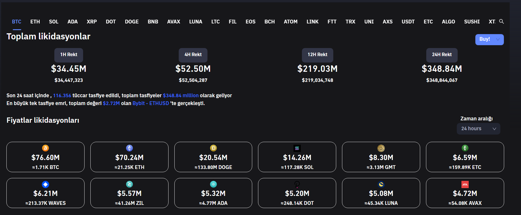 Son 24 saat içerisinde kripto piyasasında 350 milyon dolar likit edilmiş durumda. 116.366 adet yatırımcı likit edilirken en çok likit olunan kripto para yine Bitcoin oldu.