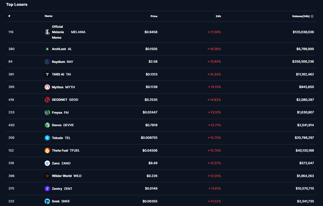 Bugünün ilk saatlerinde birçok altcoin’de çöküş yaşansa da, sonrasında BTC hakimiyetinin düşmesi altcoin’lerdeki düşüşlerin oranının azalmasını sağladı. Son gelen bilgilere göre ilk 500 kripto para birimi içerisinde bugün özelinde en büyük düşüşü -%21 ile MELANIA gerçekleştirdi.