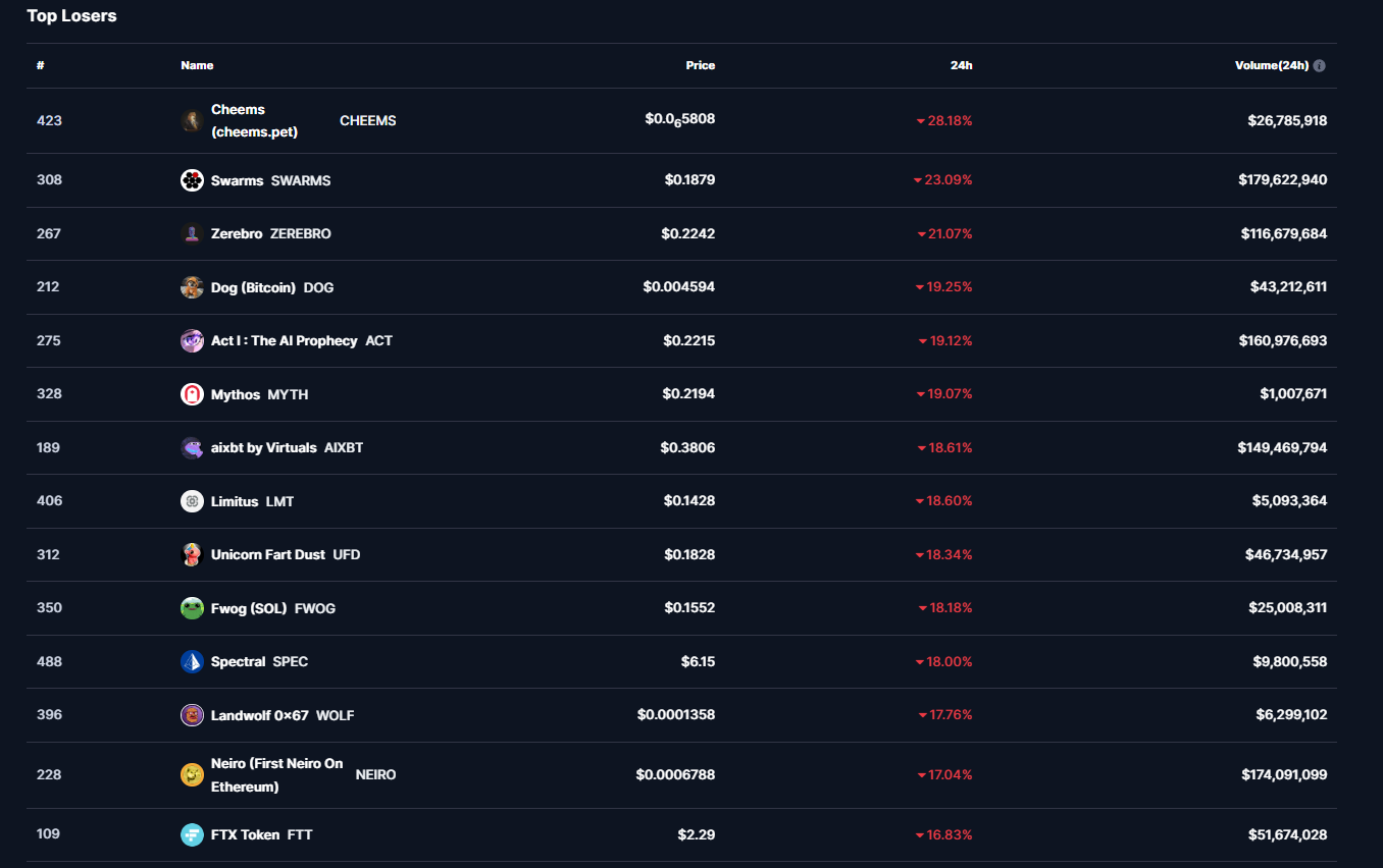 Başarılı veri sağlayıcısı CoinMarketCap’in aktardıklarına göre ilk 500 kripto para birimi içerisinde son 24 saat özelinde en çok düşüşü %28 ile birlikte CHEEMS isimli altcoin gerçekleştirdi.