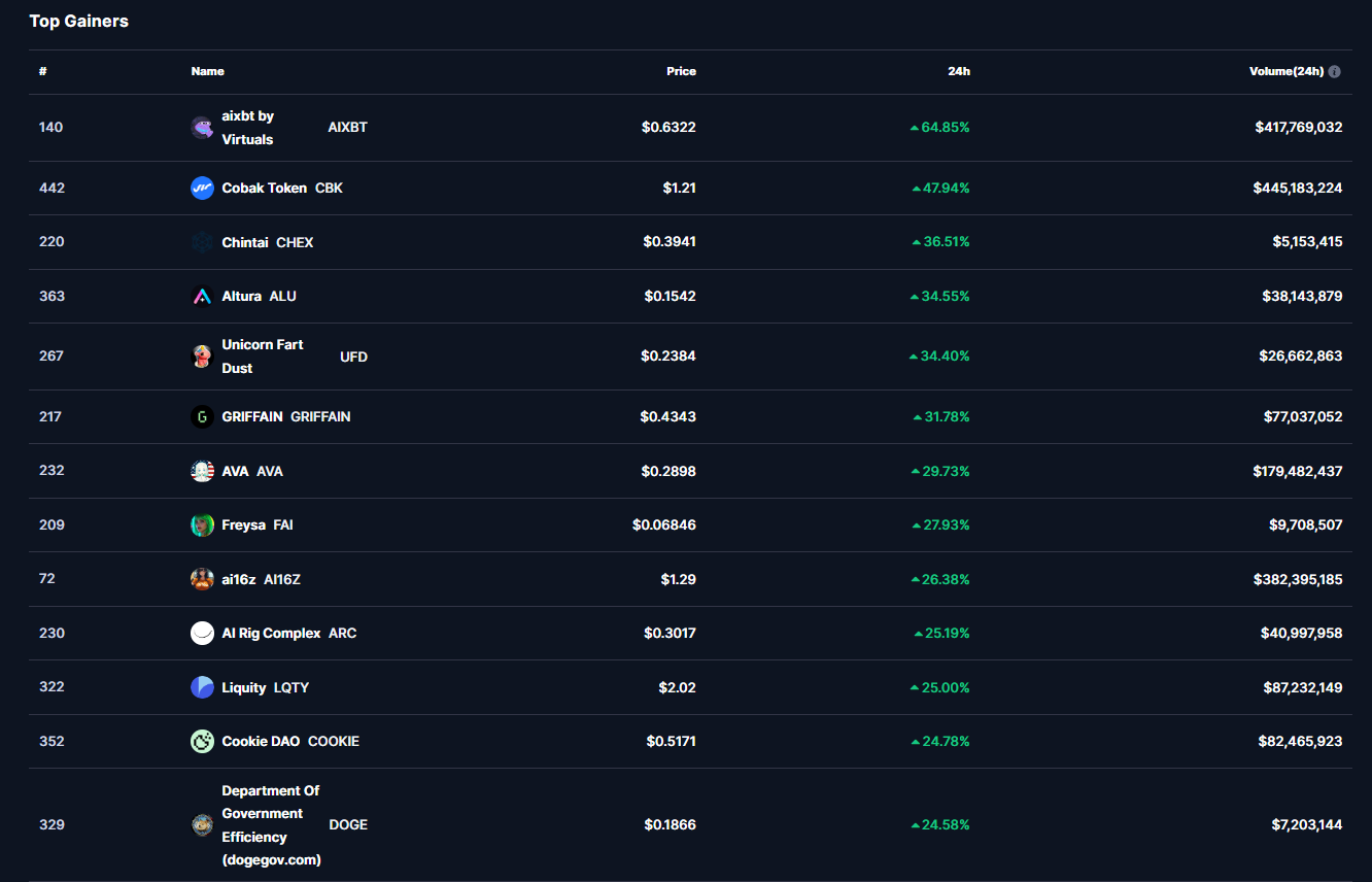 Başarılı veri sağlayıcısı CoinMarketCap’in aktardıklarına göre ilk 500 kripto para birimi içerisinde son 24 saat özelinde en çok artışı %64 ile birlikte AIXBT isimli altcoin gerçekleştirdi.
