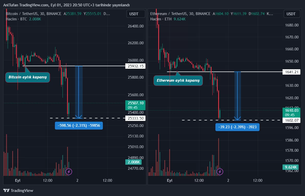 Dün gece özelinde 26 bin dolar seviyelerine aylık kapanışını gerçekleştiren BTC, bugün içerisinde 25.300 dolara kadar yüzde 2.5’luk bir düşüş gerçekleştirdi.