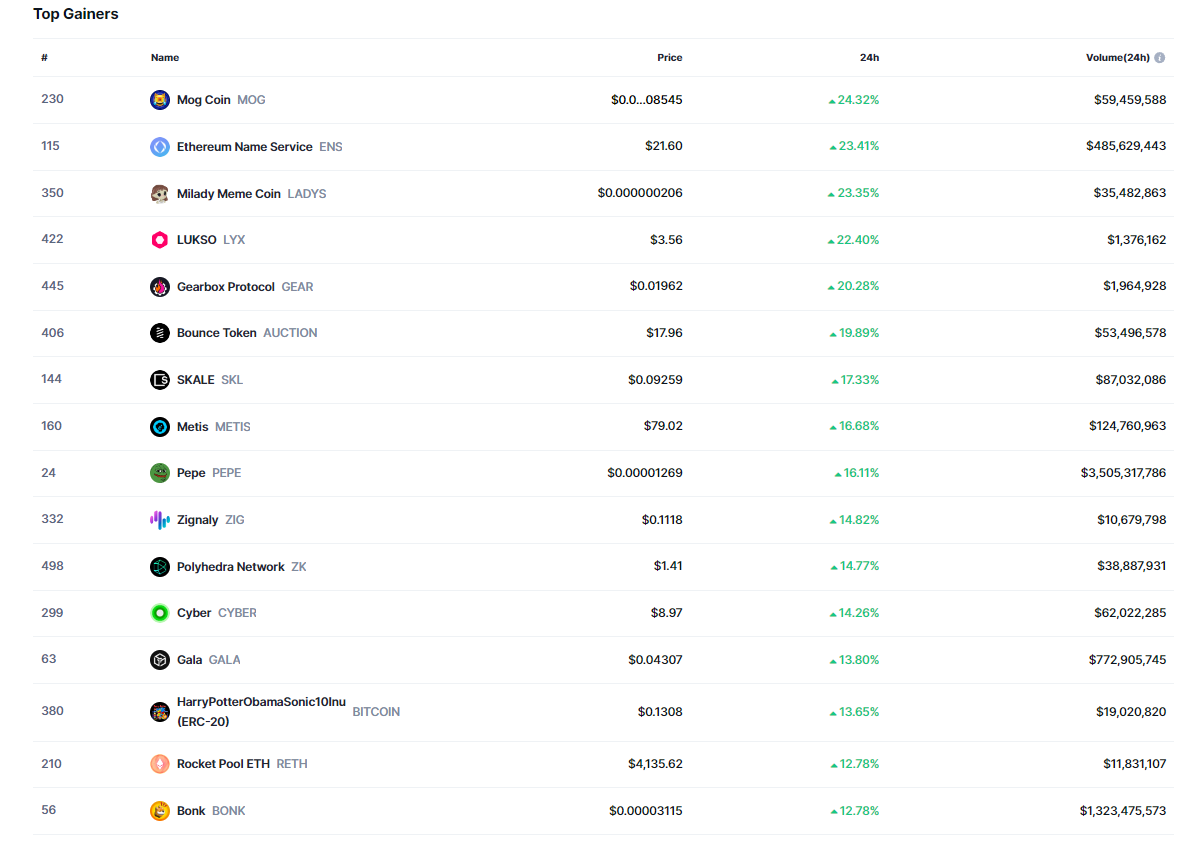 Başarılı veri sağlayıcısı CoinMarketCap’in aktardıklarına göre son 24 saat içerisinde ilk 500 kripto para birimi özelinde en çok artışı Mog coin (MOG) yaşadı.